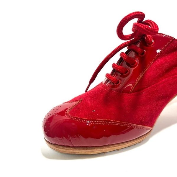 Zapato de flamenco Menkes modelo Algazara, gama Profesional 1, combinado charol , ancho C. Tacón clásico de 5cm forrado, con clavos.