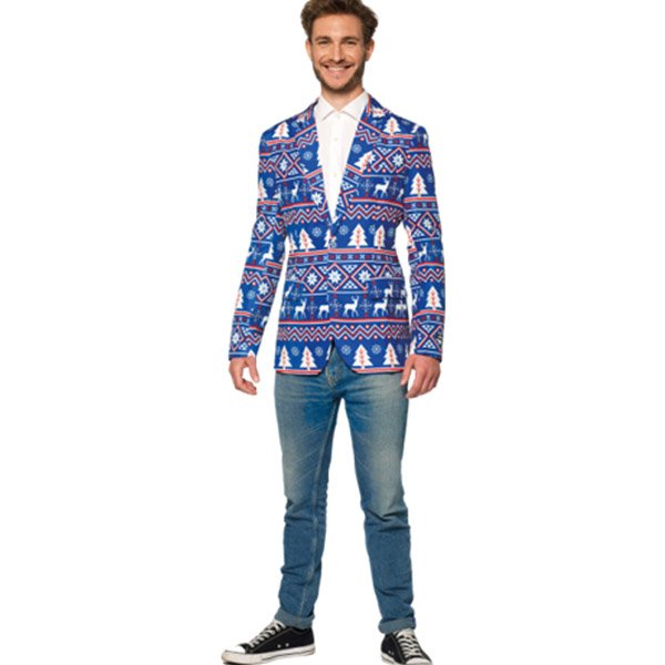Este blazer navideño nórdico azul eleva cada atuendo. Diseñado con un ajuste ceñido, bolsillos reales y un estampado festivo, este artículo te hace destacar con estilo durante toda la temporada navideña.