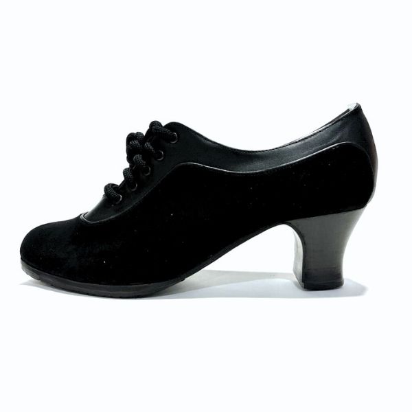 Zapato de flamenco Menkes modelo Arroyo, gama Profesional, ante + piel negro, ancho B. Tacón semi carrete de 5cm laminado negro, con clavos.