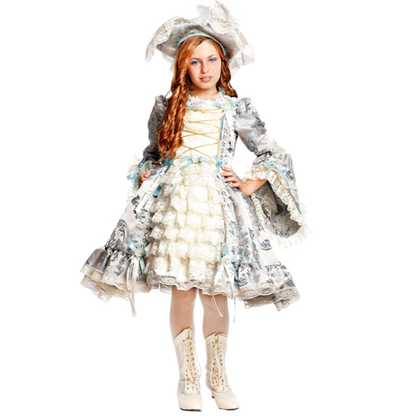 Compuesto por importante vestido en tejido damasco, frontal con volantes de encaje aplicado sobre satén de algodón con collar de perlas, cuerpo acabado con encaje, pedrería, pedrería y pasamanería dorada, aplicaciones de cintas y flores y botones de joya, tocado de damasco con pluma acabado de encaje y pasajero dorado, bañador de algodón. Zapatos y calcetines no incluidos.