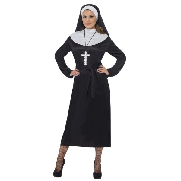 Disfraz de monja negro, con vestido, cinturón y tocado. Descubre el encanto y la elegancia del Disfraz de Monja. Perfecto para fiestas, Halloween o representaciones teatrales.