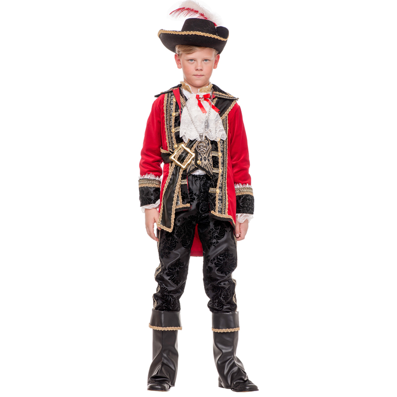 Compuesto de camisa en satén blanco, chaqueta de terciopelo rojo con insertos de tejido damasco negro bordeado por acabados dorados, pantalones de tejido damasco negro, funda bota y cinturón de piel simil, sombrero a juego, espada y gancho, collar con cráneo. Zapatos no incluidos.