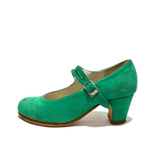 Zapato de flamenco Menkes modelo Mirabra, gama Profesional 1, talla 33, ante trevol, ancho B. Tacón clásico de 5cm forrado, con clavos.