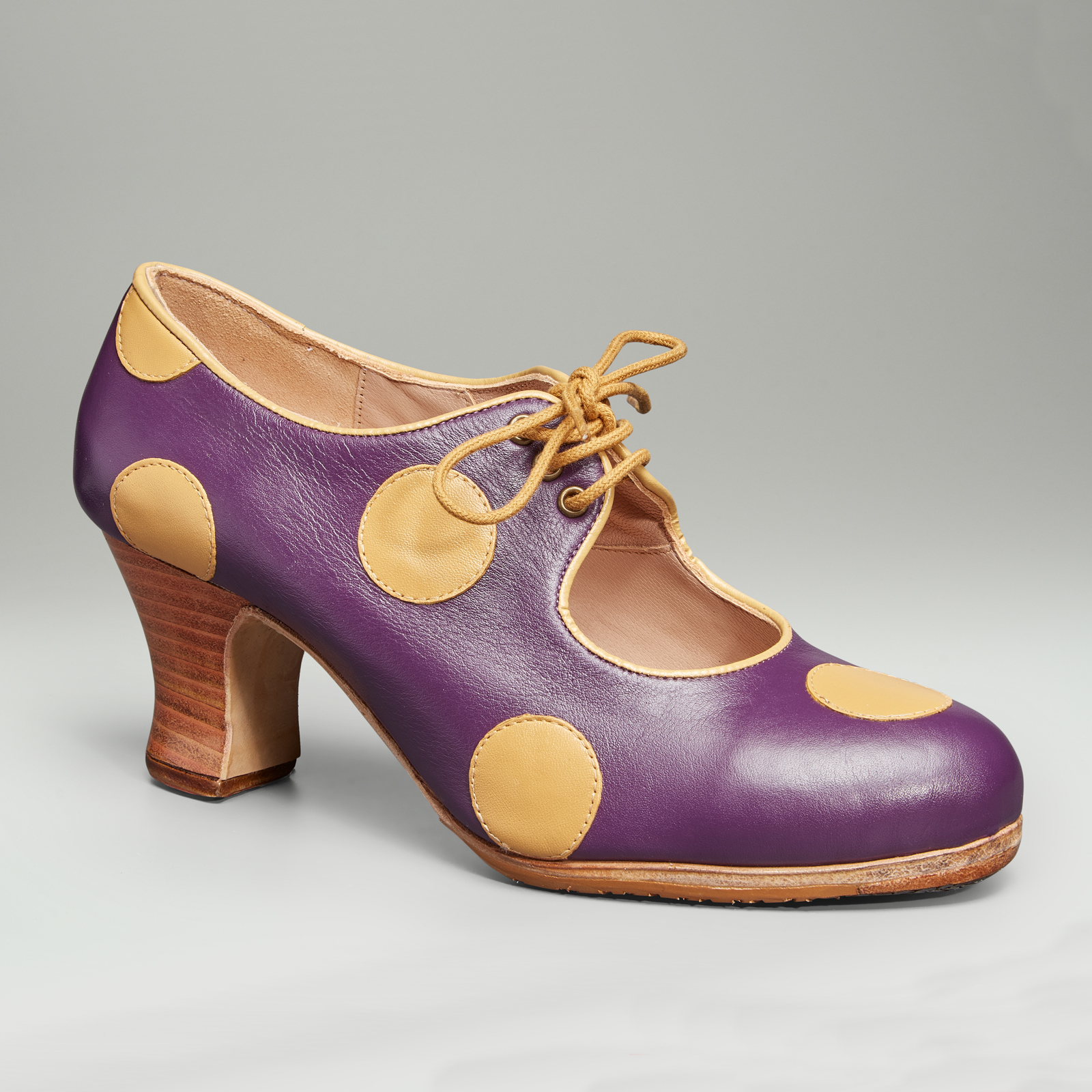 Zapato de flamenco Polka con cierre de cordones y lunares. Se puede personalizar en colores, tacón y tipo de pieles (piel y ante). No existe en gama académico. ¡Si no encuentras tu color, talla o personalización ideal, contáctanos!