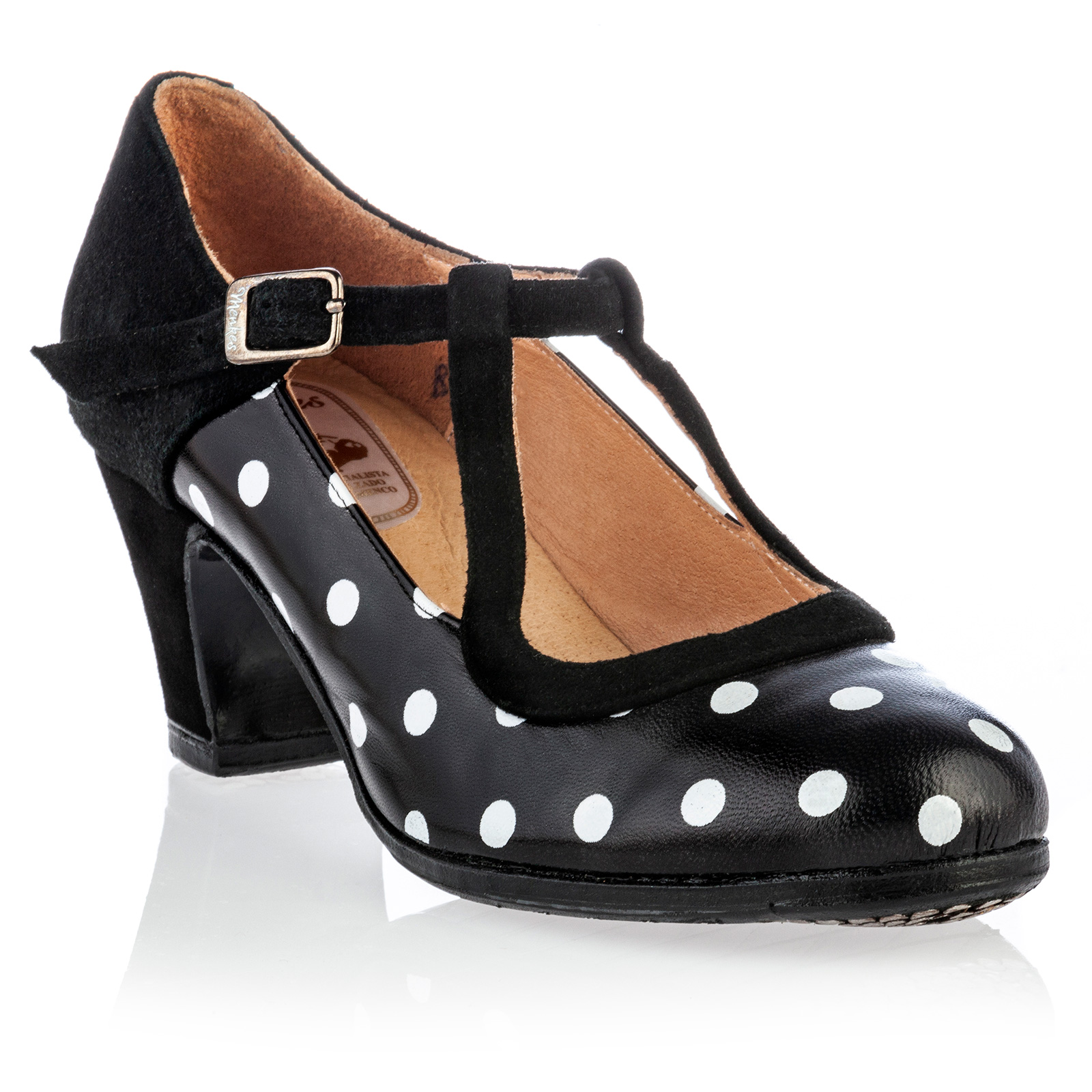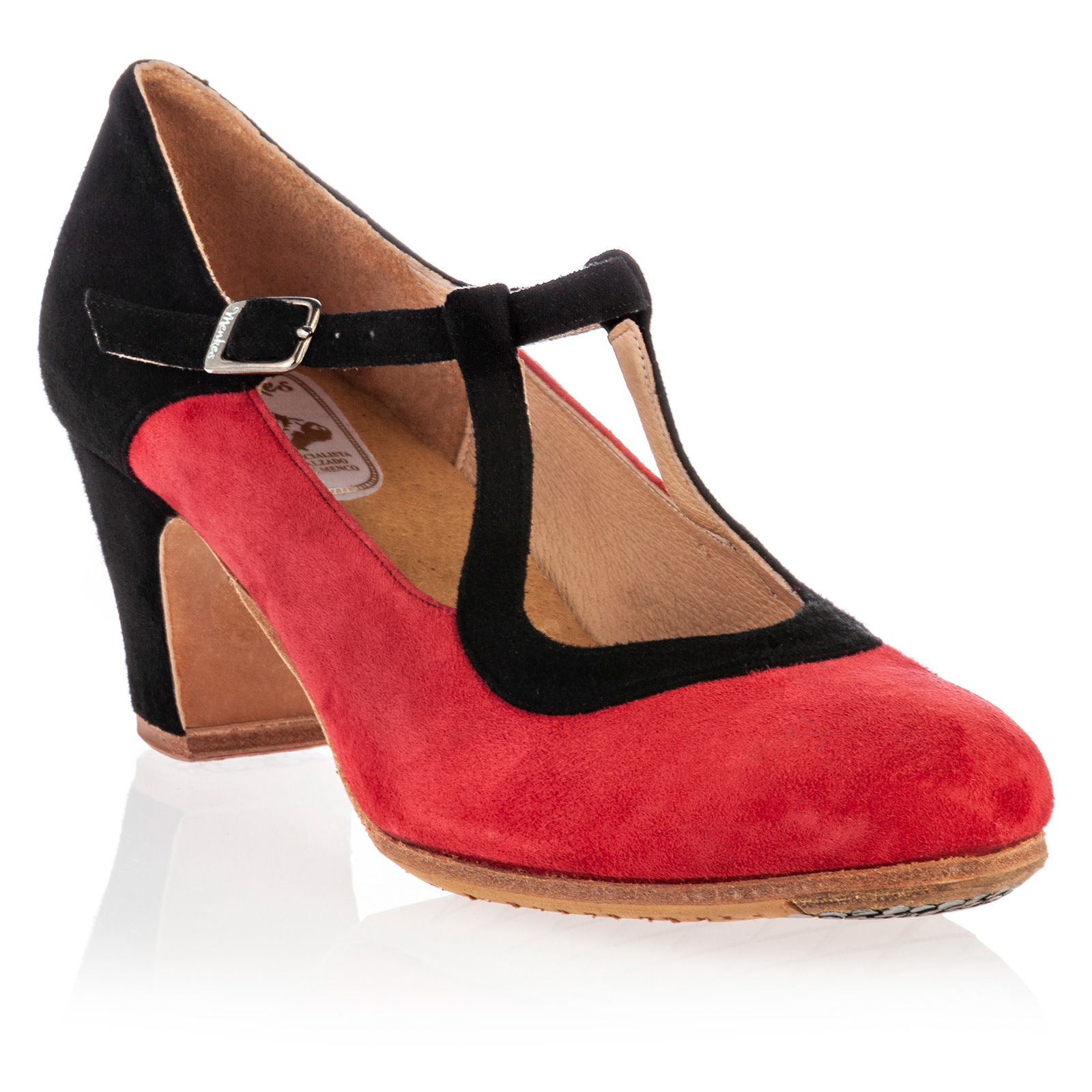 Zapato de flamenco modelo Rocio con dos tiras hacia el tobillo, cierre en hebilla y detalle en el collarín.