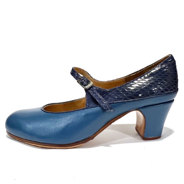 Zapato de flamenco Menkes modelo Ruedo, gama Profesional, piel Azafata + piel especial, ancho B. Tacón clásico de 5cm forrado, con clavos.