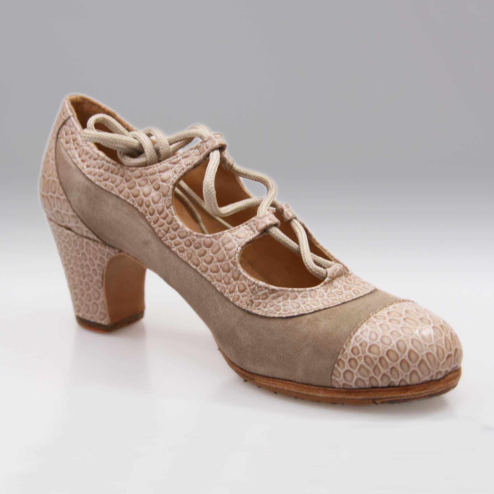 Zapato de flamenco Sargantana con cierre de cordones cruzados y detalles de piel especial en la puntera y el talón.