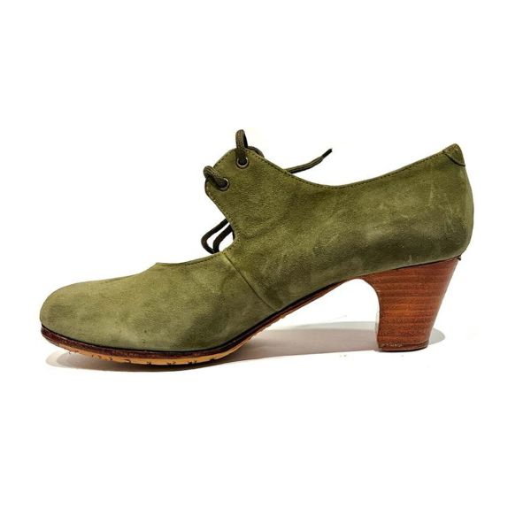 Zapato de flamenco Menkes modelo Sevilla, gama Profesional, ante nadine, ancho B. Tacón clásico de 5 cm laminado natural, con clavos.