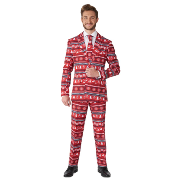 Este traje navideño nórdico rojo con pixel art es tu mejor amigo durante toda la temporada navideña. Tiene un elegante estampado retro con colores vibrantes y muestra tu espíritu navideño. El outfit se compone de blazer, pantalón y corbata. Los pantalones tienen una cintura ajustable para un ajuste perfecto.