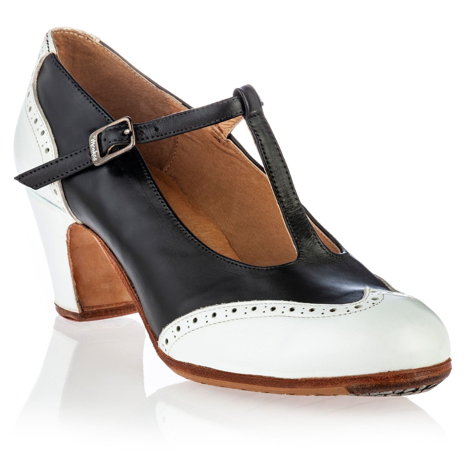 Zapato de flamenco Vega con tira central y adornos en la puntera y el talón.